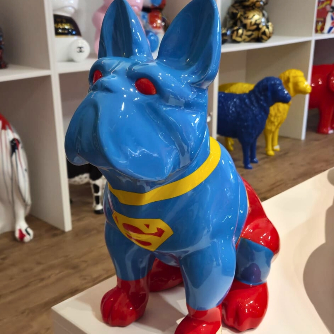 Chien en résine Bouledogue Superman design, idéal pour es amateurs de supers héros et Marvels.