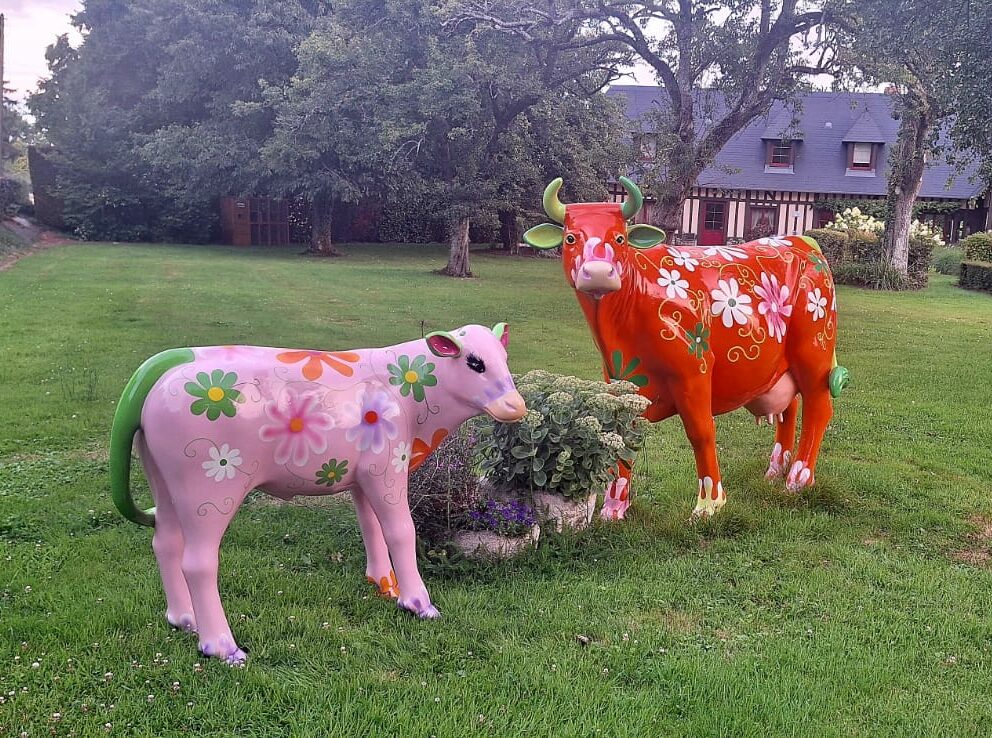 Statue en résine de vache laquée vernie peinte à la main en résine fibrée triple couche – Création design sur mesure – Collection flower power – fond orange mais autre coloris au choix – finition vernie laquée – haut de gamme et qualité